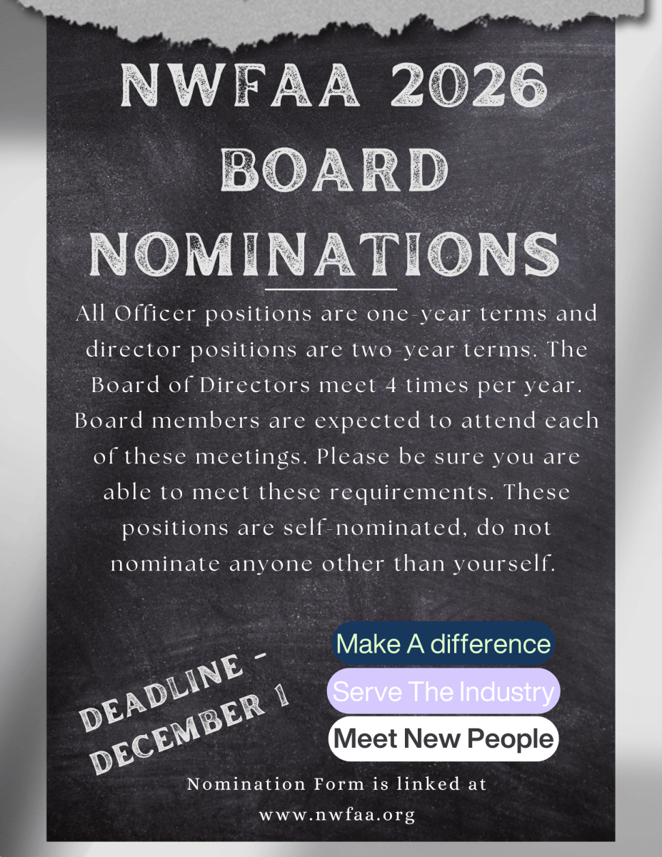 Are you interested in serving on the NWFAA Board of Directors? The nominating committee is now accepting nominations for 2026! Use the link below to nominate yourself.